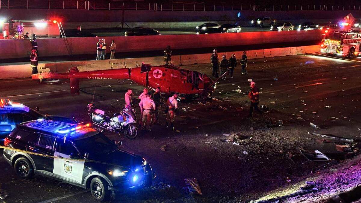 The helicopter ended up upside-down in the center of the highway, leaving a substantial debris field.